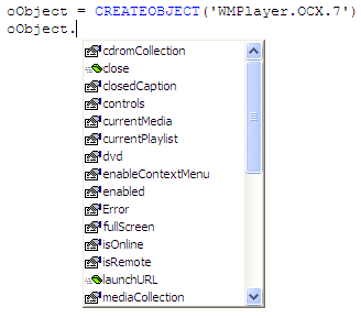 (How did we know the ID was 'WMPlayer.OCX.7'? See here for how to subclass the object and determine this)oObject = CREATEOBJECT('WMPlayer.OCX.7')