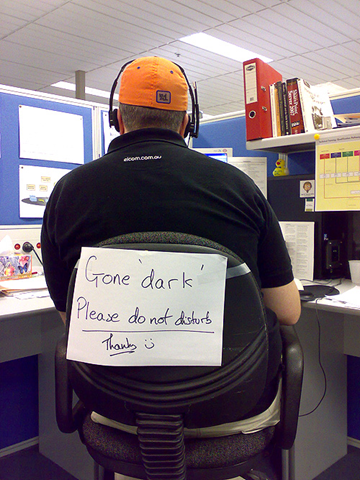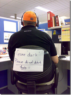 Microsoft developers (I’m told) have the option to ‘go dark’ at times. At least that’s what Joe Schwetz indicated at a recent Sydney Deep meeting. The aim is to allow them to catch up on projects that are running behind. The process involves killing all distractions (email, blogs, phone calls, IM, etc) and focusing on priorities.