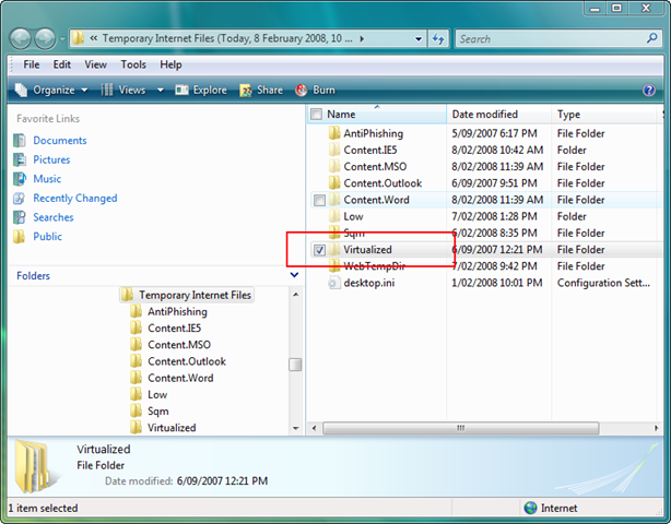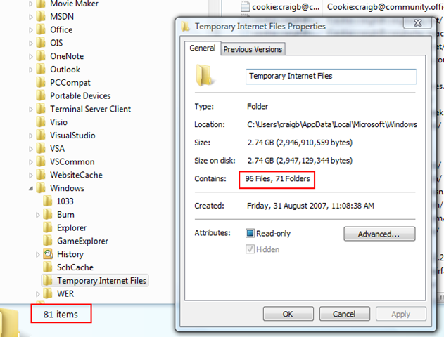 If you've got this far then you know roughly where the files are. But here's the problem: If you go and look at the Temporary Internet Files folder in Windows Explorer the directories are hidden. You'll see below that Windows shows it as having 0 subdirectories and 81 files (and that is in fact all you can see) where as the Properties for the subdirectory shows 96 files and 71 folders.
